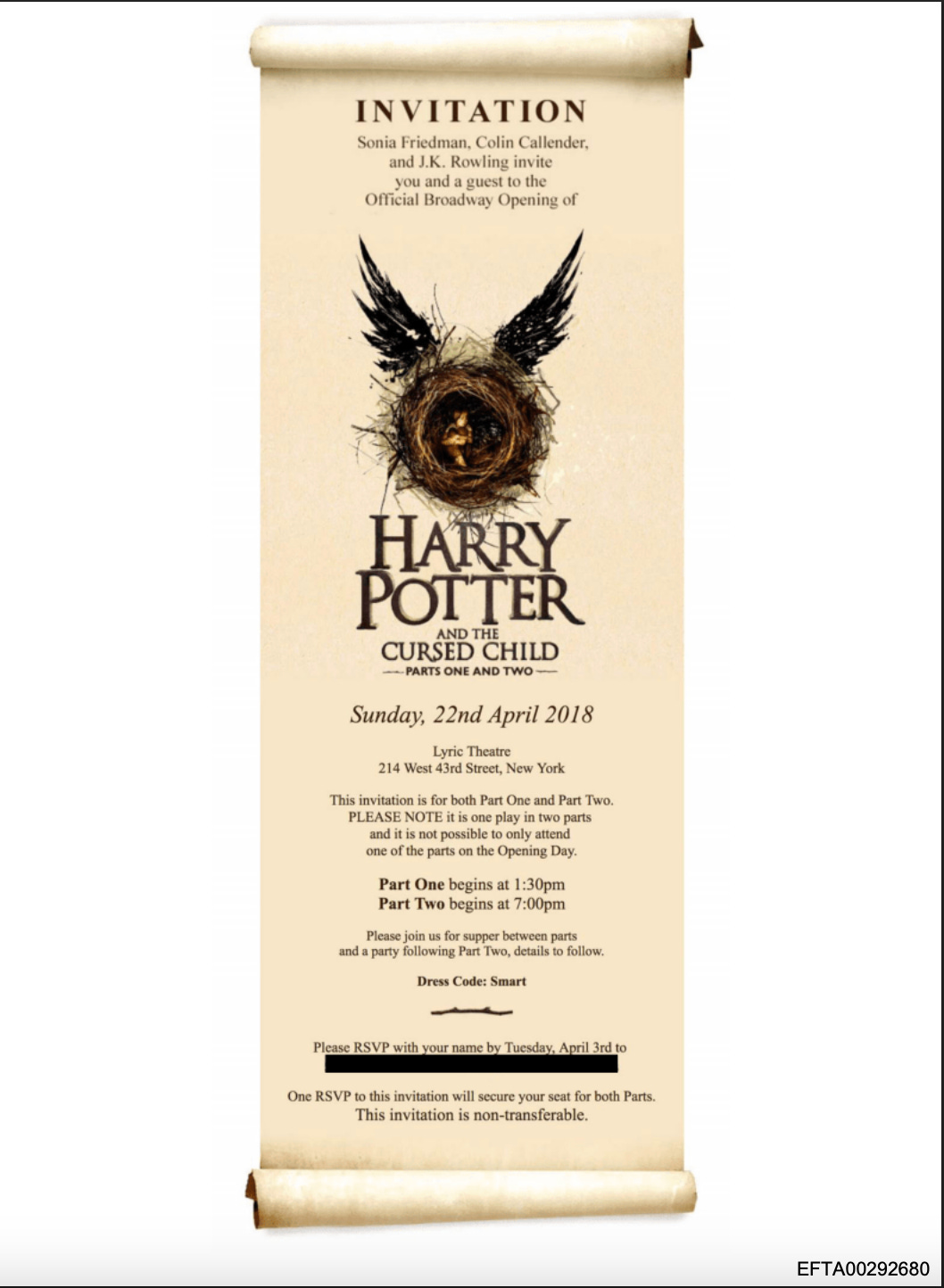 Let’s take a look at this invite. There are a few things that immediately stand out, such as the RSVP date (3rd April 2018) and the names at the top of the invitation: Sonia Freidman and Colin Callender (the show’s producers) and J.K. Rowling (the author). The invite also looks pretty generic, as though it was meant to be sent out en masse - so, not personalized.