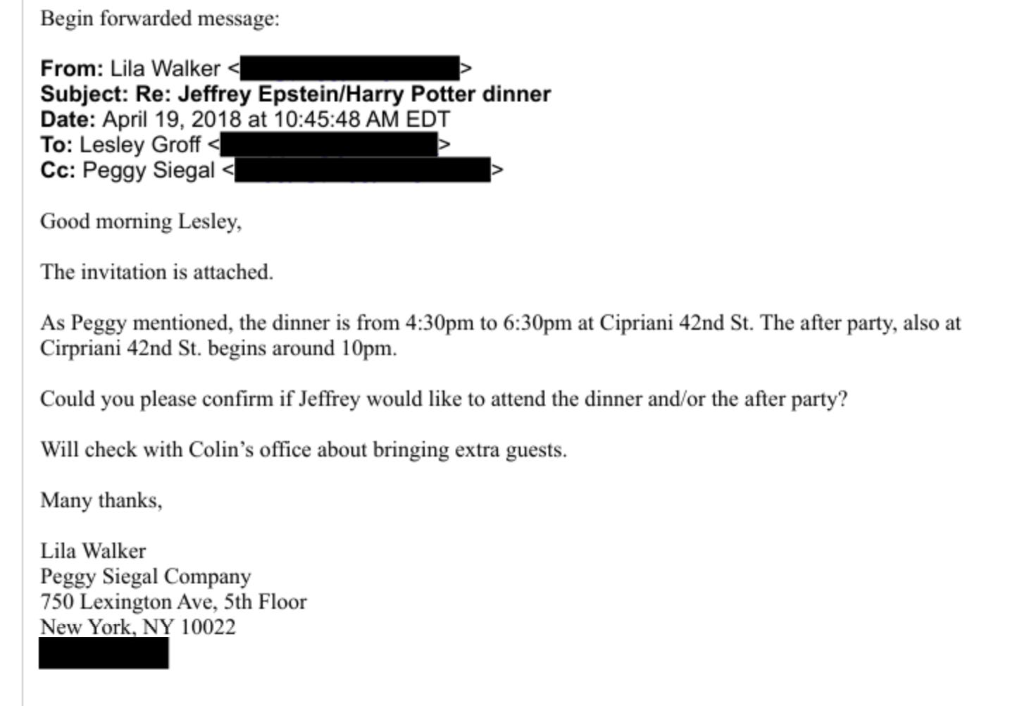 On 16th April 2018, someone (probably Groff) e-mailed Siegal asking for “details for Peggy’s Harry Potter party” for Epstein’s schedule. The next day, another e-mail to his driver, Luciano Fontanilla, continues to refer to this as “Peggy Siegal’s party.” The party is mentioned to be at Cipriani’s, which could refer to one of several restaurants in New York City.